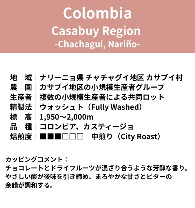 -カップコメント- チョコレートとドライフルーツが混ざり合うような芳醇な香り。 やさしい酸が後味を引き締め、まろやかな甘さとビターの余韻が調和する。 -内容量- 100g -焙煎度- 中煎り(City Roast) -地域- ナリーニョ県チャチャグイ地区 カサブイ村 -生産者- 複数の小規模生産者による共同ロット -精製- ウォッシュト(Fully Washed) -標高- 1,950m〜2000m -品種- コロンビア、カスティージョ -備考- *チャック付きのパッケージでお届けします *焙煎後2ヶ月以内が美味しくお飲みいただけます *粉でのご購入の場合、2〜3週間以内が美味しくお飲みいただけます *豆のままか、粉かお選びください *ご注文より5営業日以内に発送とさせていただきます