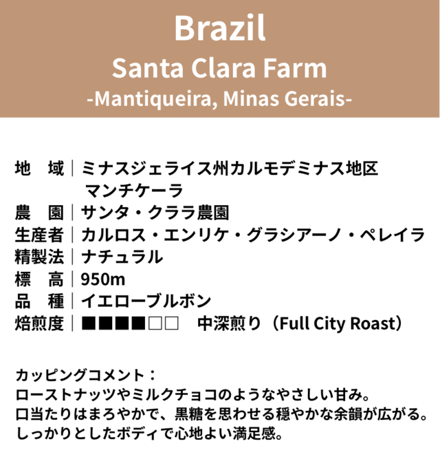 -カップコメント- ローストナッツやミルクチョコのようなやさしい甘み。 口たりはまろやかで、黒糖を思わせる穏やかな余韻が広がる。 しっかりとしたボディで心地よい満足感。 -内容量- 100g -焙煎度- 中深煎り(Full City Roast) -生産地- ミナスジェライス州/カルモデミナス地区マンチケラ -農園- サンタ・クララ農園 -生産者- カルロス・エンリケ・グラシアーノ・ペレイラ -精製- ナチュラル -標高- 950m -品種- イエローブルボン -備考- *チャック付きのパッケージでお届けします *焙煎後2ヶ月以内が美味しくお飲みいただけます *豆のままか、粉かお選びください *粉でのご購入の場合、2〜3週間以内が美味しくお飲みいただけます *ご注文より5営業日以内に発送とさせていただきます